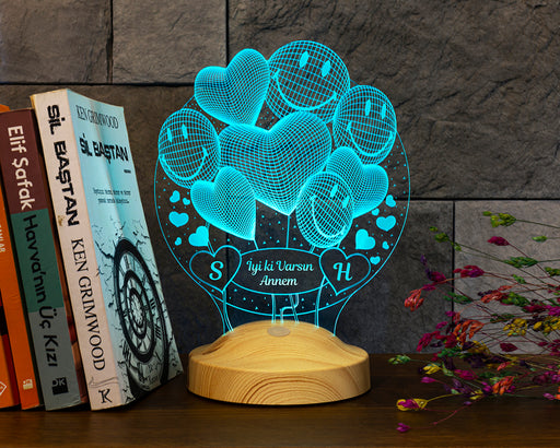 Tüm ayrıntıları görüntüleAnneler Günü Hediyesi, Anneye İsimli Hediye, Balon Kalpler Küre Kişiye Özel 3D Led Lamba