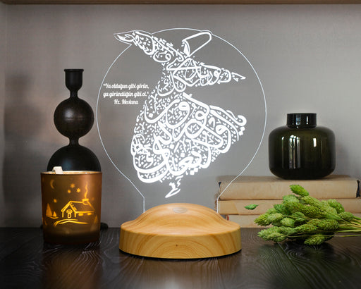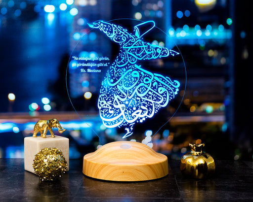 Tüm ayrıntıları görüntüleSemazen Figürlü Mevlana Sözlü 3D Lamba – Manevi Hediye Seçeneği
